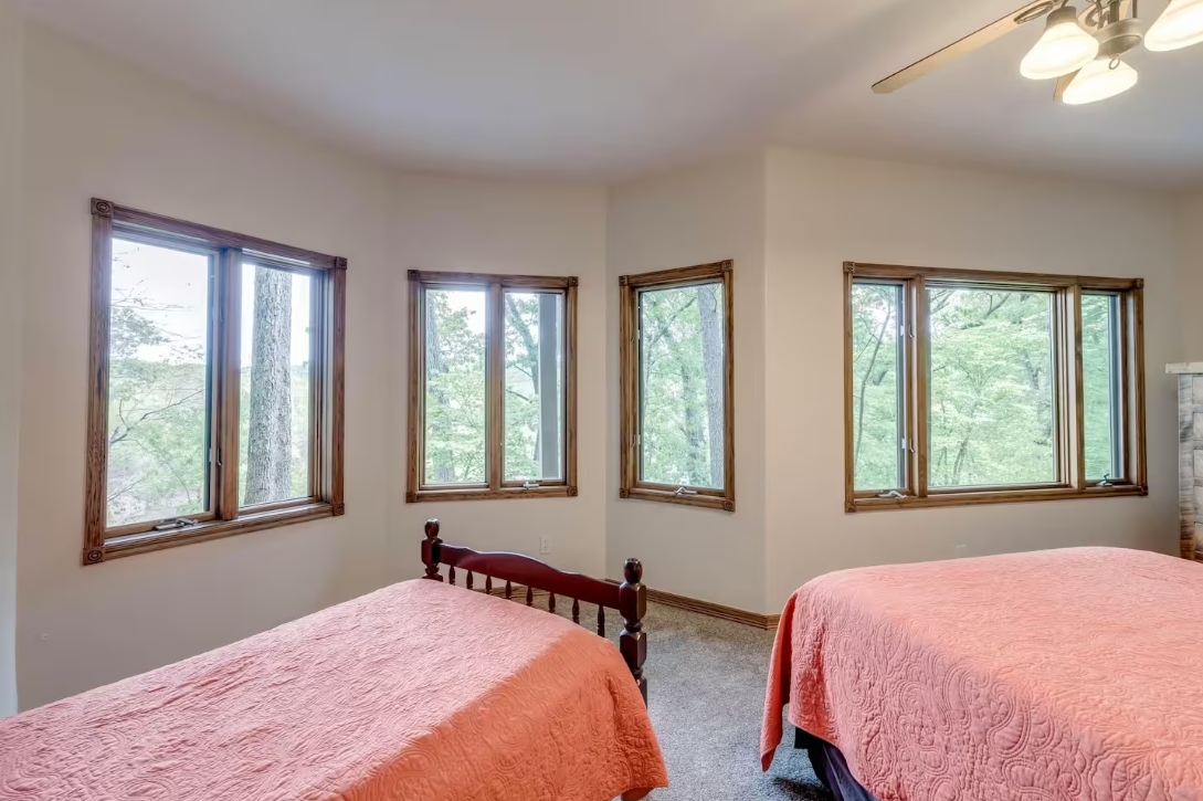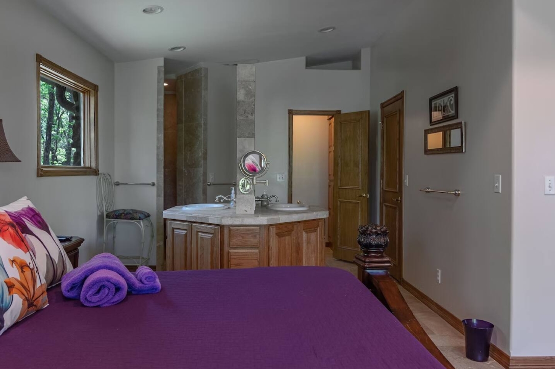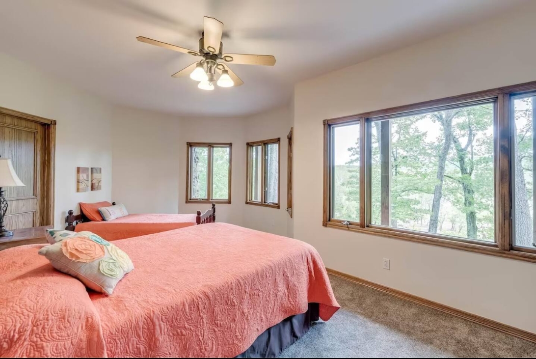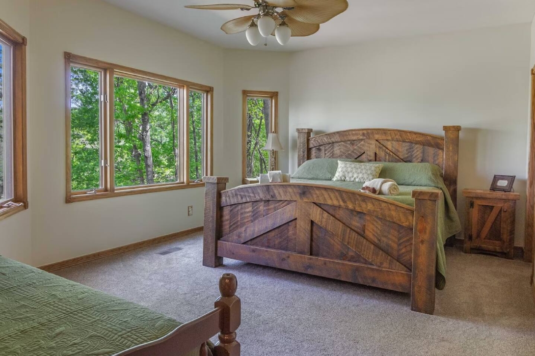 Bending Waters is a modern and elegant vacation home in the foothills of the Ozark Mountains, surrounded by a five-acre private wooded area. It offers comfortable accommodation for up to 13 people in four bedrooms, two and a half bathrooms, and two family rooms with wood-burning fireplaces. The master bedroom has a private deck, a gas fireplace, and a two-person Jacuzzi. The kitchen has a dining area with a view of the river and a formal dining room. All rooms have large windows that overlook the Illinois River and the wooded acreage, and an outside security system monitors the property.