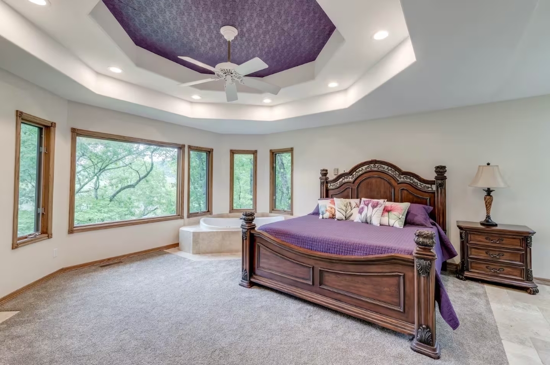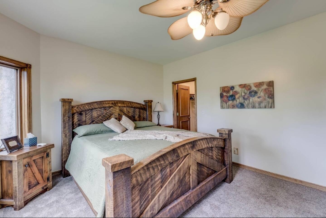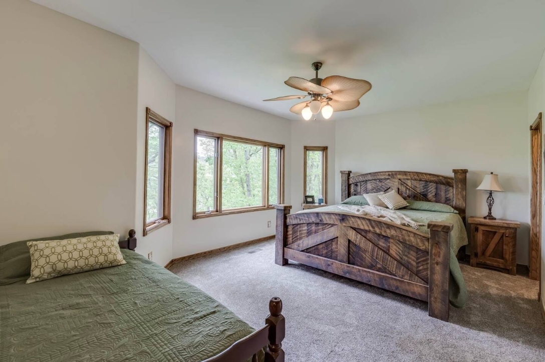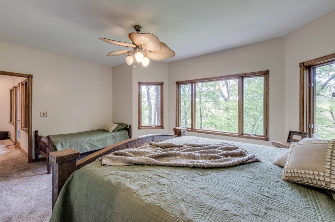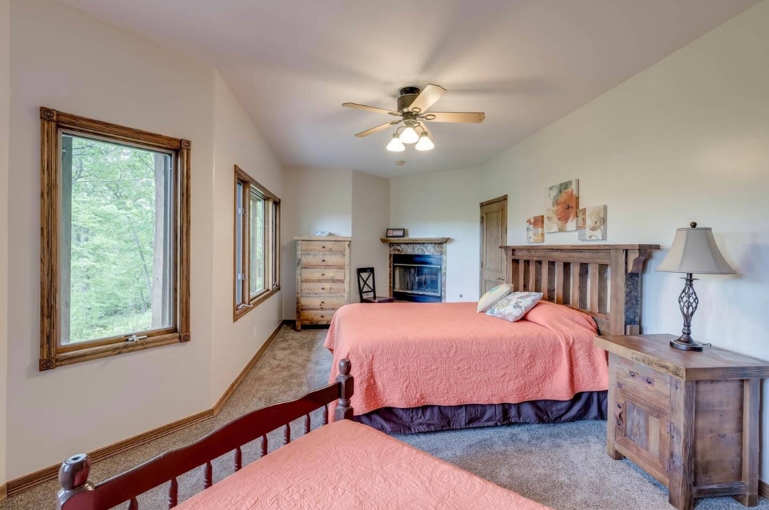 Bending Waters is a modern and elegant vacation home in the foothills of the Ozark Mountains, surrounded by a five-acre private wooded area. It offers comfortable accommodation for up to 13 people in four bedrooms, two and a half bathrooms, and two family rooms with wood-burning fireplaces. The master bedroom has a private deck, a gas fireplace, and a two-person Jacuzzi. The kitchen has a dining area with a view of the river and a formal dining room. All rooms have large windows that overlook the Illinois River and the wooded acreage, and an outside security system monitors the property.