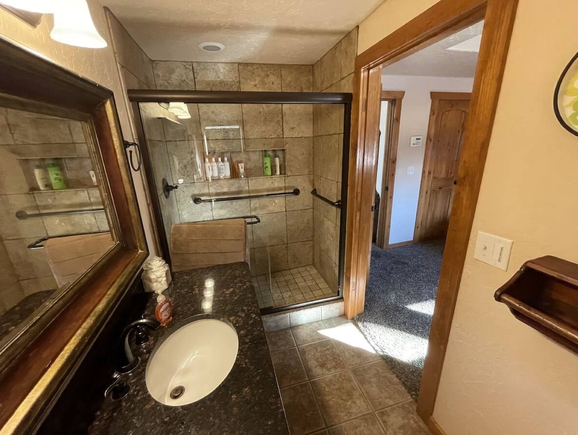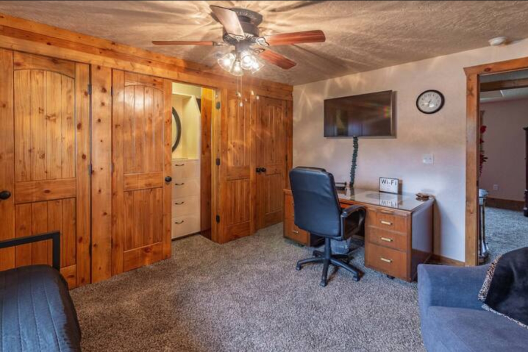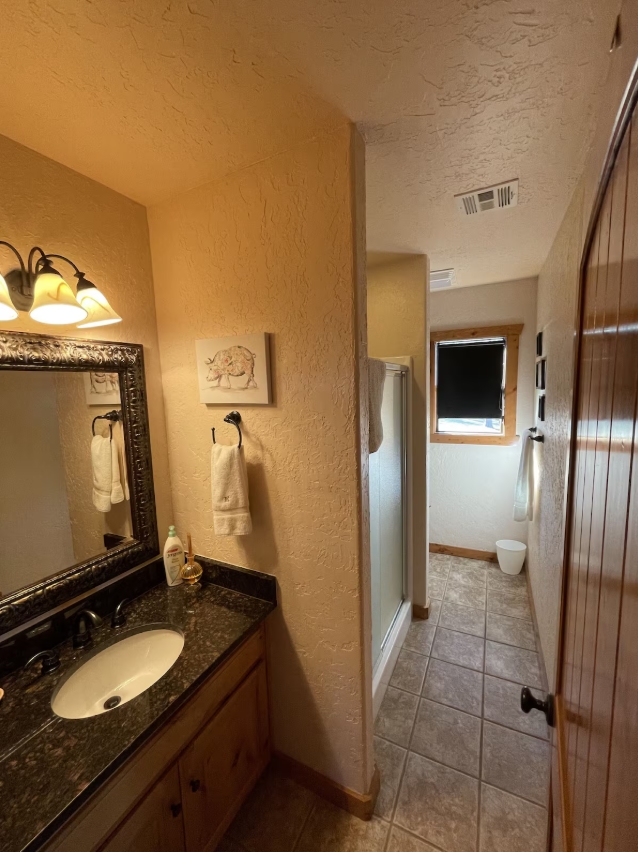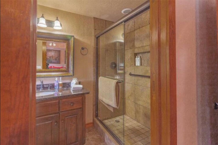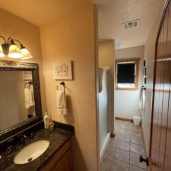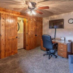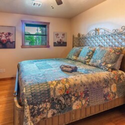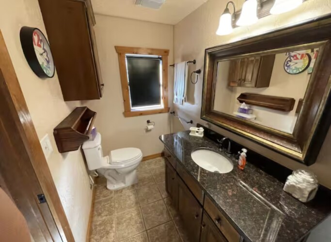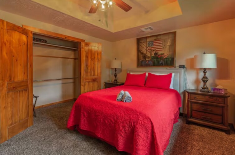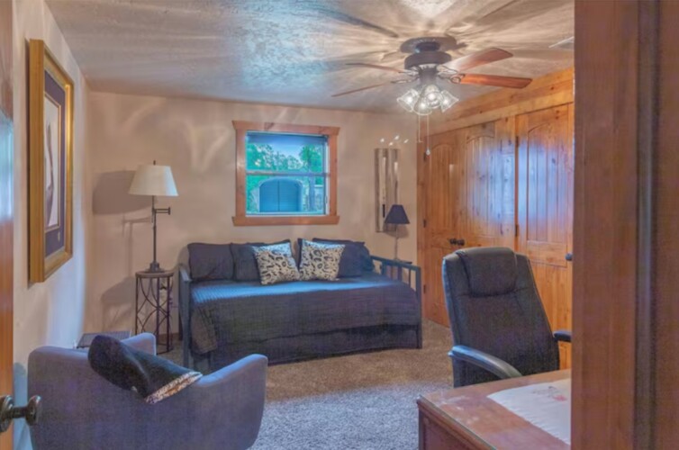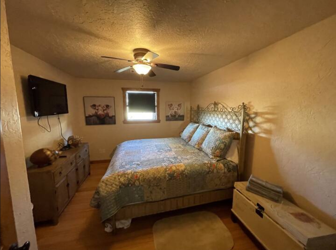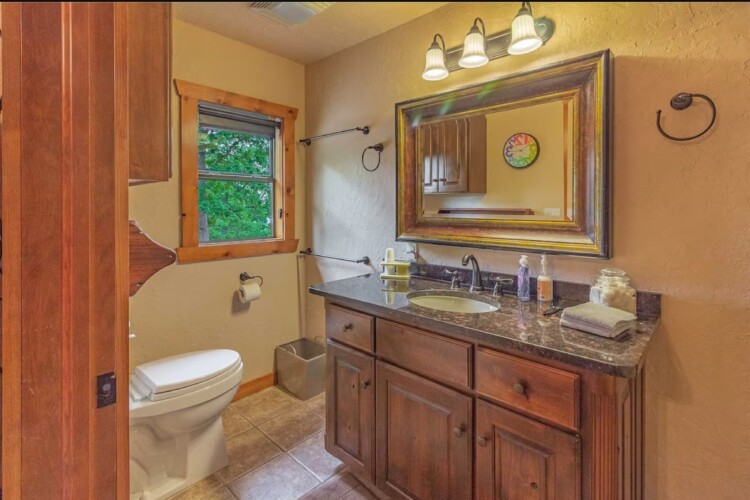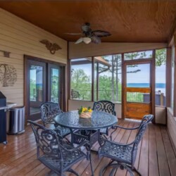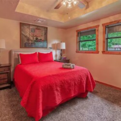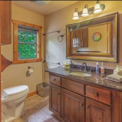Eva’s Roost offers three comfortable bedrooms, with four beds that can sleep up to 6 guests. The cabin features two full bathrooms, providing ample space and convenience for all guests. The porch/veranda is the perfect spot for sipping coffee or watching the sunset over the lake.
